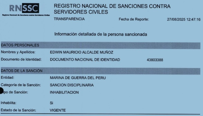 Sin embargo, al momento de su contratación, León se encontraba inhabilitado para contratar con el Estado, según el Módulo de Consulta Ciudadana del Registro Nacional de Sanciones contra Servidores Civiles – RNSSC – de SERVIR. Pese a esa restricción expresa, la orden fue aprobada, firmada y ejecutada por la jefatura Logística, Administración y Legal de PROREGIÓN.