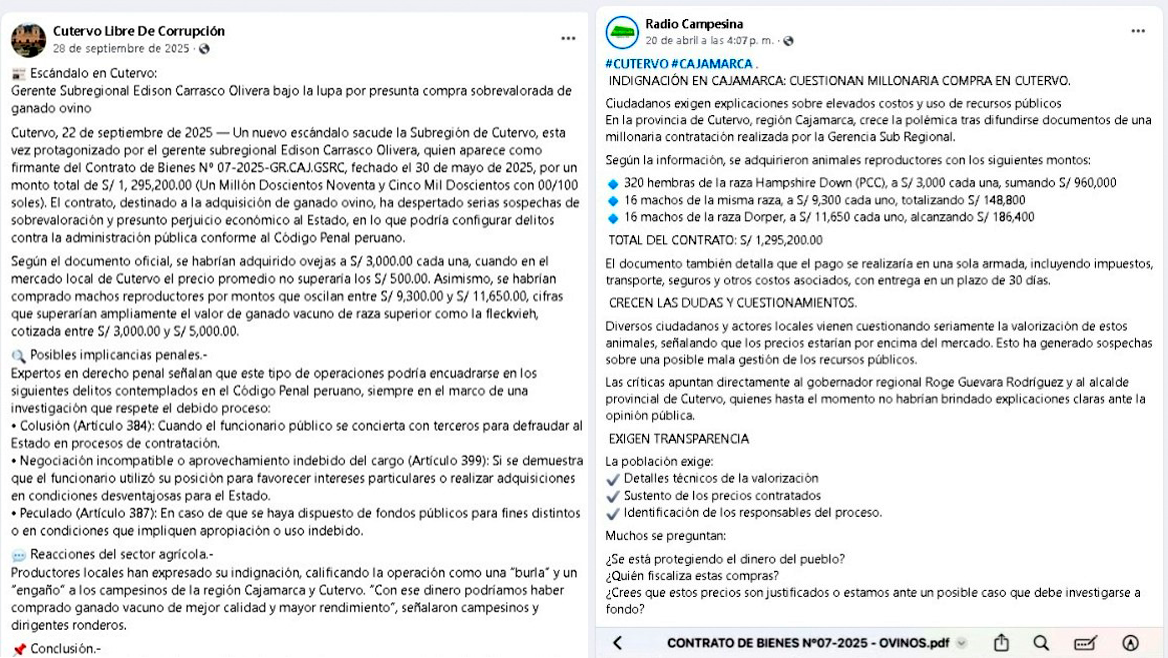 La publicación en la Fan Page Cutervo Libre De Corrupción utiliza el contrato Contrato de Bienes N.º 07-2025-GR.CAJ.GSRC para realizar la denuncia de sobrevaloración. En tanto, la publicación de Radio Campesina utiliza la imagen del exgerente de la Gerencia Subregional de Cutervo, Edison Carrasco Olivera y un recorte de una parte del contrato antes mencionado y aunque los textos son un tanto diferentes, en el fondo hablan del mismo tema. La sobrevaloración.