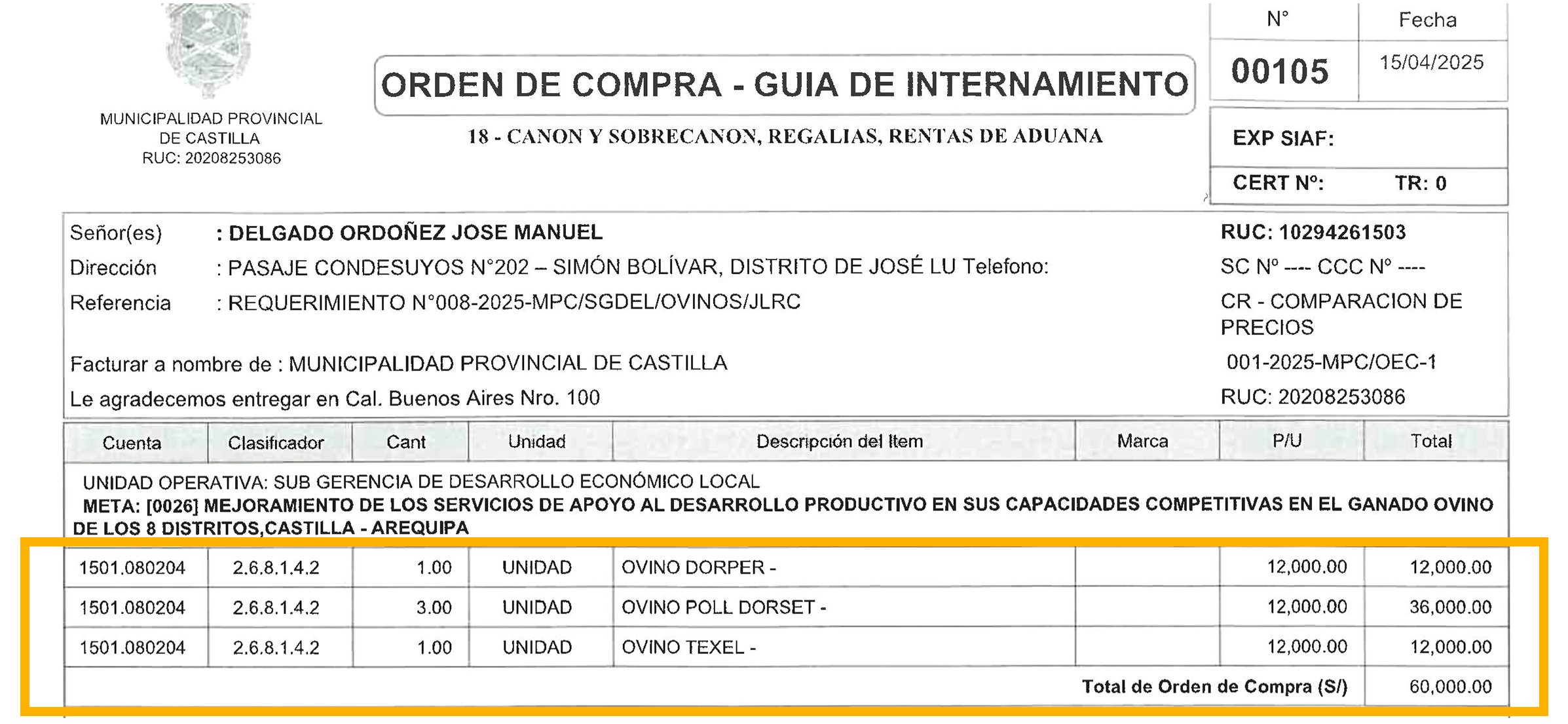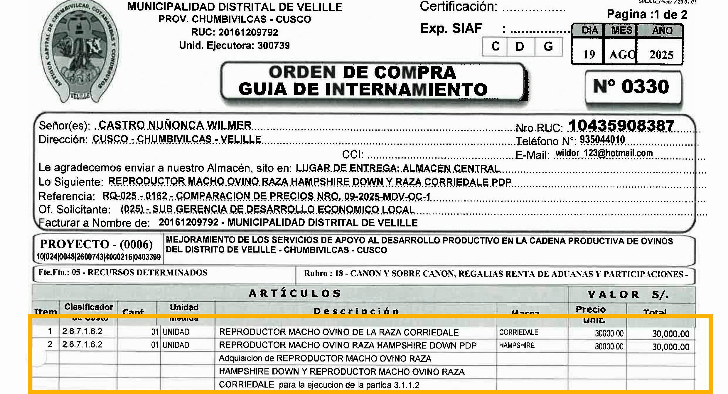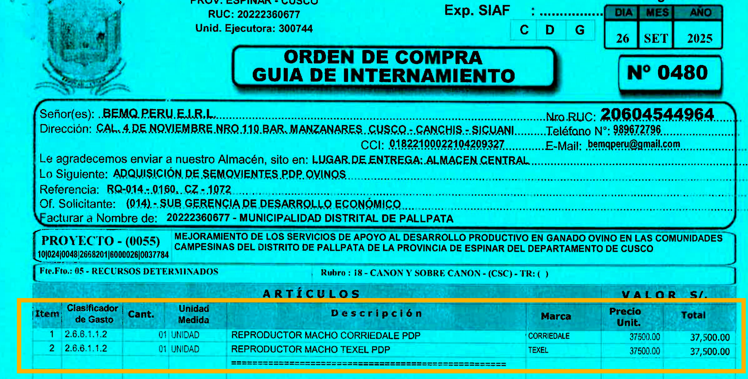 La Municipalidad Distrital de Pallpata, en Espinar, registra una compra en el mes de setiembre también del 2025 de 1 reproductor macho Corriedale por S/ 37,500 y un reproductor macho Texel por S/ 37,500. Total de la compra: S/ 75,000. Pero aquí si los documentos son contundentes, porque se pagaron hasta S/ 37,500 por unidad, superando ampliamente otras compras, como la de la Gerencia Subregional de Cutervo y las municipalidades antes mencionadas.