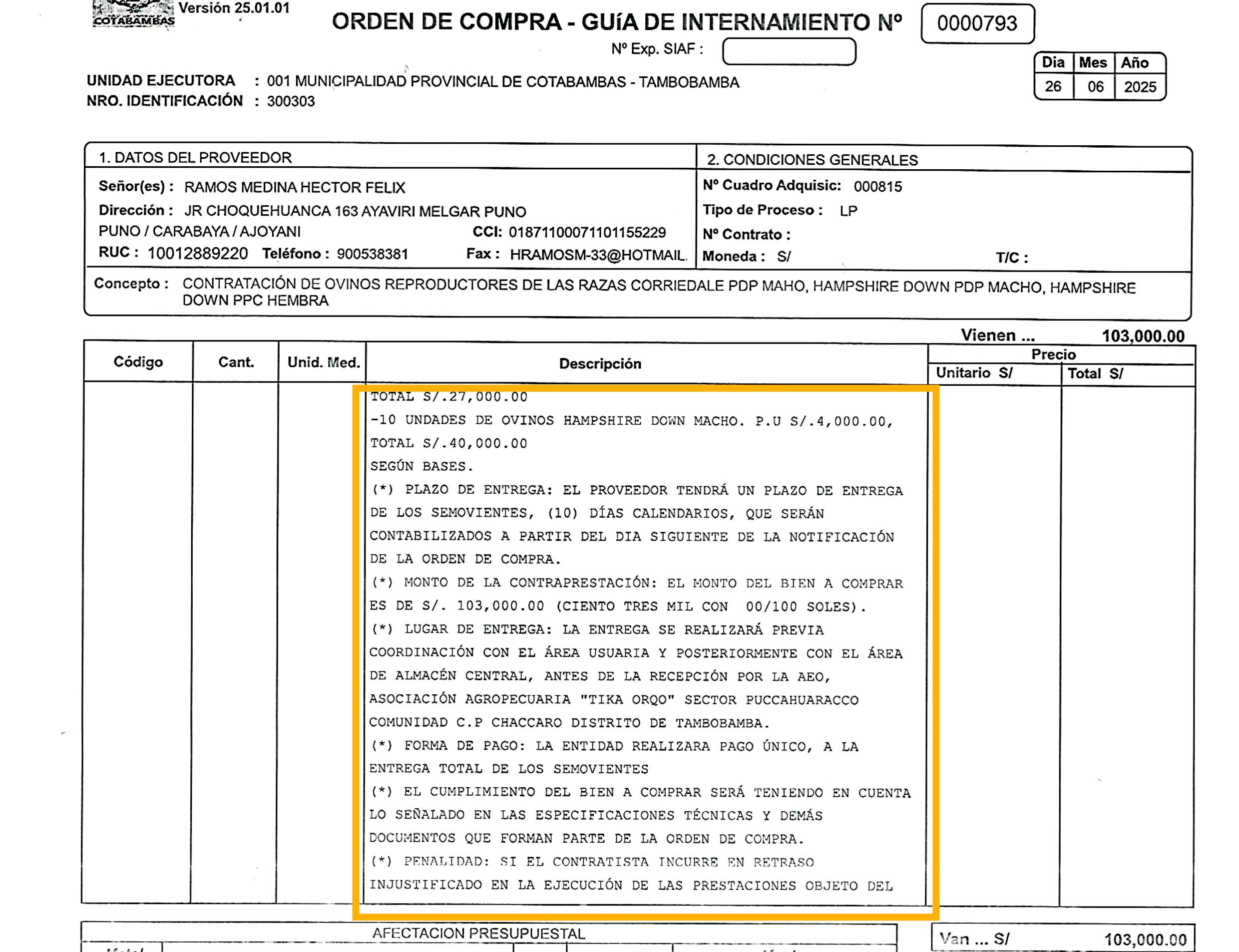 La Municipalidad Provincial de Cotabambas, en junio del 2025 compró 3 Corriedale macho por S/ 12,000 cada uno; 2 Hampshire Down macho por S/ 13,500 cada uno y 10 Hampshire Down hembra por S/ 4,000, también cada uno. En total la compra salió por S/ 103,000. Pero aquí hay un dato que no pasa desapercibido, porque, aunque hay valores menores, los reproductores de mayor calidad genética superan los S/ 12 mil y S/ 13,500, asemejándose al rango técnico observado en otros procesos.