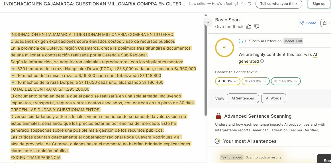 Este medio ha pasado filtros que reconocen textos generados por Inteligencia Artificial – IA. Y el texto del medio de comunicación de Cajamarca arroja un 100% elaborado por aplicaciones de IA.