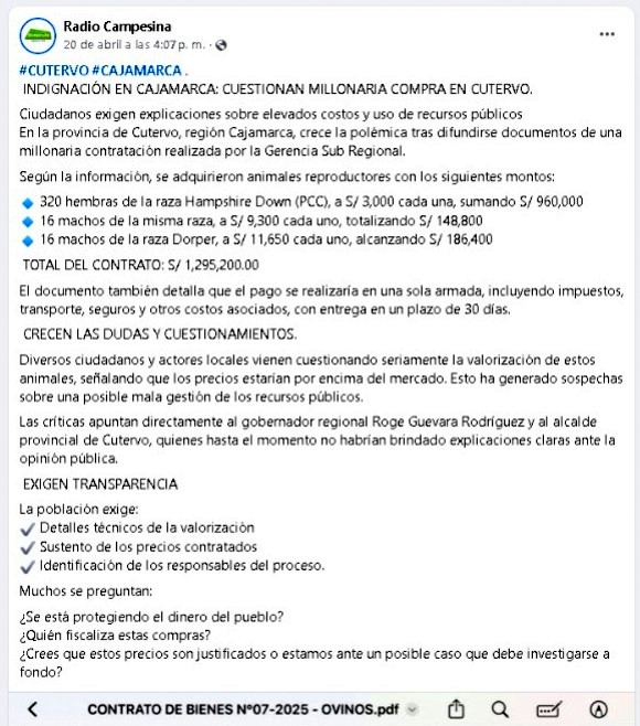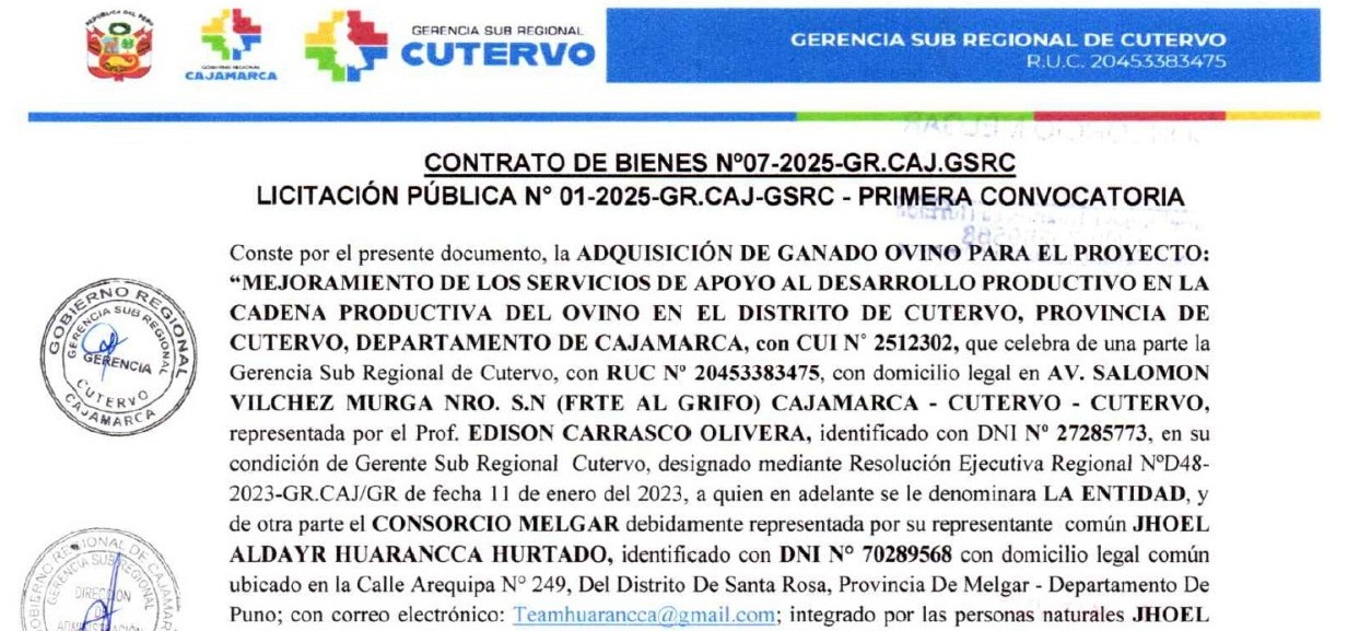 En los últimos días la adquisición de ovinos reproductores, compra realizada por la Gerencia Subregional de Cutervo, ha sido cuestionada bajo la sospecha de una presunta sobrevaloración. Según los registros, no es la primera vez que aparece esta nota. En el año 2025 también apareció una publicación con el mismo texto en la página Cutervo Libre De Corrupción, pero adjuntando el Contrato de Bienes N.º 07-2025-GR.CAJ.GSRC.