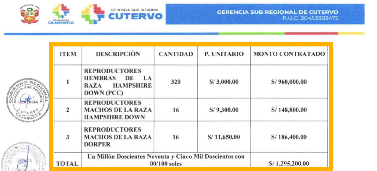 El Contrato N.º 07-2025-GR.CAJ.GSRC de la Gerencia Subregional de Cutervo registra la compra de 352 ovinos por S/ 1,295,200, como precio total. Pero del desglose de la compra, que aparece en el SEACE, con CUI N° 2512302, se compraron 320 hembras Hampshire Down a S/ 3,000 cada una, 16 machos Hampshire Down a S/ 9,300 cada uno y 16 machos Dorper a S/ 11,650 cada uno.