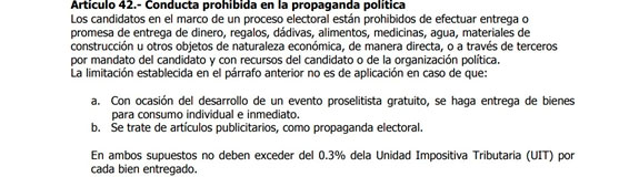 En ese sentido, la Ley de Organizaciones Políticas del Perú, en su artículo 42, es claro al establecer que durante el proceso electoral “los candidatos están prohibidos de entregar dinero, regalos, dádivas u otros bienes de valor económico con el fin de inducir el voto”. Esta importante disposición fue incorporada “para evitar prácticas clientelistas como la entrega de dinero, víveres, materiales de construcción, electrodomésticos u otros bienes que representen un beneficio económico significativo para el elector”.