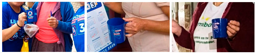 Las imágenes, por contrario, muestran que los artículos distribuidos tienen la forma de tazas o recipientes tipo “mug”, en los que se distingue el logotipo del partido Alianza Para El Progreso. En el material revisado por este medio no se identifican envases de productos lácteos enlatados.