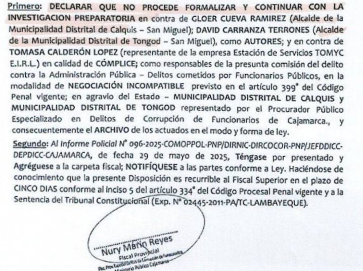 La Fiscalía Provincial Especializada en Delitos de Corrupción de Funcionarios de Cajamarca archivó la investigación que seguía contra los alcaldes distritales de Tongod y Calquis, David Carranza Terrones y Gloer Cueva Ramírez, respectivamente, así como contra Tomasa Calderón López, representante de la empresa Estación de Servicios TOMYC E.I.R.L., por el presunto delito de negociación incompatible. La resolución, emitida el 11 de junio de 2025 por la fiscal Gina del Pilar Ramírez Malca, concluye que no existen elementos suficientes para continuar el proceso penal.