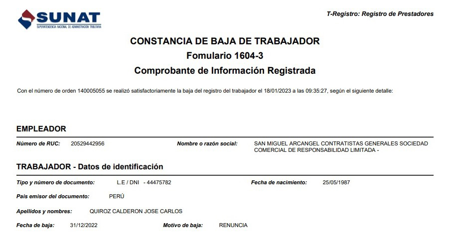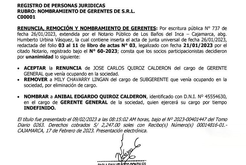En registros públicos SUNARP, Quiróz sale de toda vinculación el 21 de enero de 2023 y las contrataciones con los nuevos dueños de la empresa fueron en mayo del 2023. Según consta en el sistema de SUNAT, Quiróz cesó en sus funciones como gerente general antes del año 2022, y en SUNARP figura la formalización de su retiro societario en enero de 2023. Esta desvinculación ha sido corroborada con documentación a la que Otra Presa accedió, así como con una factura electrónica emitida por la empresa en mayo de 2023, en la que ya no aparece el nombre de José Carlos Quiróz Calderon como representante legal o firmante.