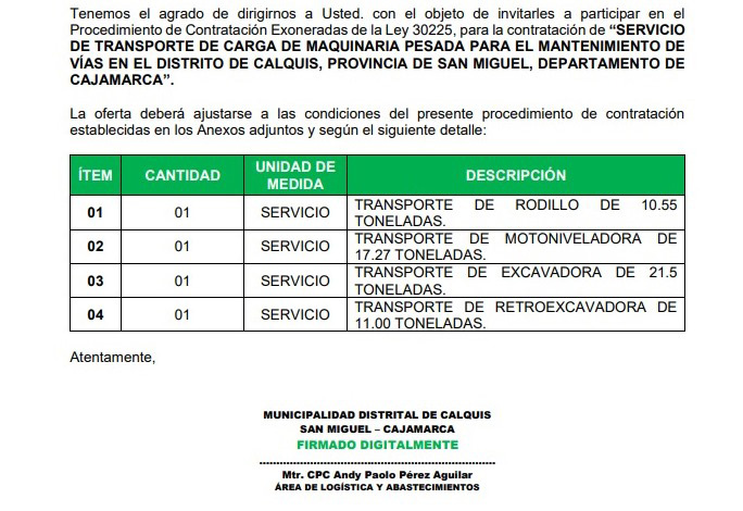 El caso que reavivó las especulaciones políticas es un contrato suscrito entre la empresa San Miguel Arcángel SRL y la Municipalidad Distrital de Calquis, para el servicio de transporte de maquinaria pesada. El proceso fue identificado como N.º 0070-2023-MDC/ALA, y dio lugar al comprobante electrónico E001-115, emitido el 3 de mayo de 2023, por un monto de S/ 13,999.99.