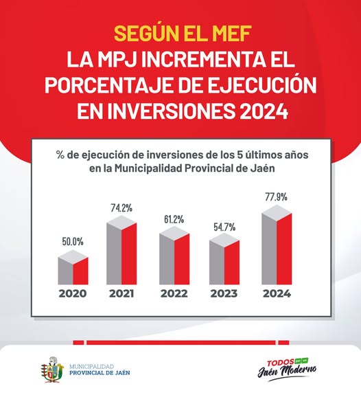 La Municipalidad Provincial de Jaén, bajo el liderazgo del alcalde José Tapia y con la gestión del Gerente General Marco Antonio Aguilar, ha alcanzado el segundo lugar en ejecución presupuestal a nivel de la región Cajamarca, de acuerdo con el portal de transparencia del Ministerio de Economía y Finanzas (MEF). Este importante logro refleja un manejo eficiente y transparente de los recursos públicos, logrando ejecutar el 77.9% del presupuesto asignado para inversiones durante el año 2024, solo superado por la provincia de San Ignacio.