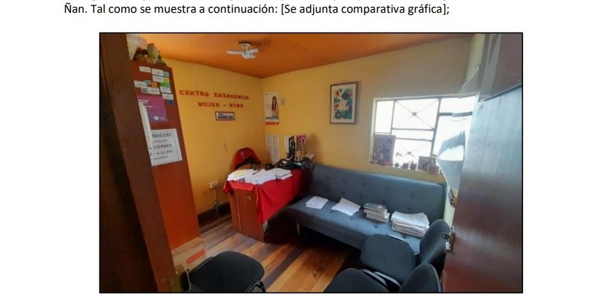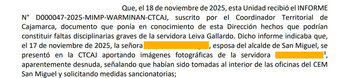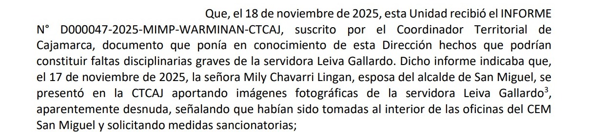 Los documentos administrativos revisados por el equipo de Otra Prensa, la denuncia que activa el proceso proviene de la esposa del alcalde, quien se apersona ante instancias del programa para reportar los hechos y entregar las imágenes materia de cuestionamiento. En esa misma línea, un informe técnico posterior menciona que existe similitud entre los ambientes observados del CEM San Miguel y las fotografías de contenido íntimo atribuidas a la trabajadora, las cuales forman parte del expediente administrativo. A esto se suma que, en base a ello, se inicia investigación contra la trabajadora por el presunto uso indebido de bienes del Estado para fines personales, sin que ello constituya prueba definitiva.