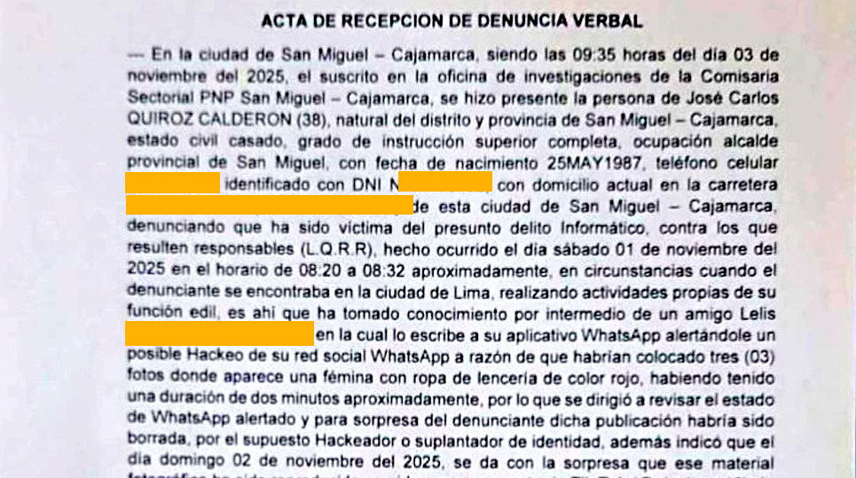 Otra Prensa accedió al acta de recepción de denuncia verbal de la Policía Nacional del Perú, de fecha 03 de noviembre de 2025, donde el alcalde provincial José Carlos Quiroz Calderón se apersonó a la dependencia policial de San Miguel para denunciar haber sido víctima de un presunto delito informático. Según los datos que brindó a las autoridades, los hechos se habrían producido el 01 de noviembre de 2025, entre las 08:20 y 08:32 horas, cuando, según el acta, encontrándose en la ciudad de Lima, tomó conocimiento de que en su estado de WhatsApp se habrían publicado tres fotografías en las que, según la denuncia del alcalde, aparecería la trabajadora en ropa íntima.