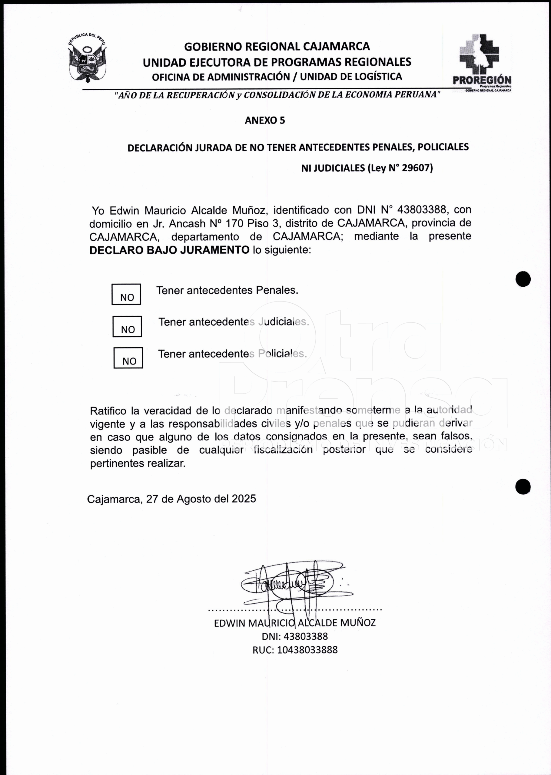 La omisión evidencia una contratación irregular e ilegal, pues se pasó por alto un impedimento legal plenamente vigente. Más aún, en los anexos (anexo 5) de declaración jurada, pagina 25, presentados por el propio Edwin Mauricio Alcalde Muñoz, este afirma no estar impedido para contratar con el Estado, lo que contradiría la verdad de los hechos y atentaría contra la fe pública, tal como establece el artículo 411 del Código Penal, que sanciona con pena privativa de libertad a quien inserte o declare falsamente información en un documento destinado a producir efectos jurídicos.