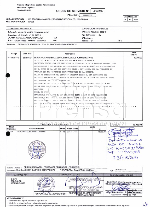 El 28 de agosto de 2025, PROREGIÓN Cajamarca emitió la Orden de Servicio N.º 0000245, respaldada por la Certificación Presupuestal N.º 000396, para la contratación de “servicios de asistencia legal en procesos administrativos”.