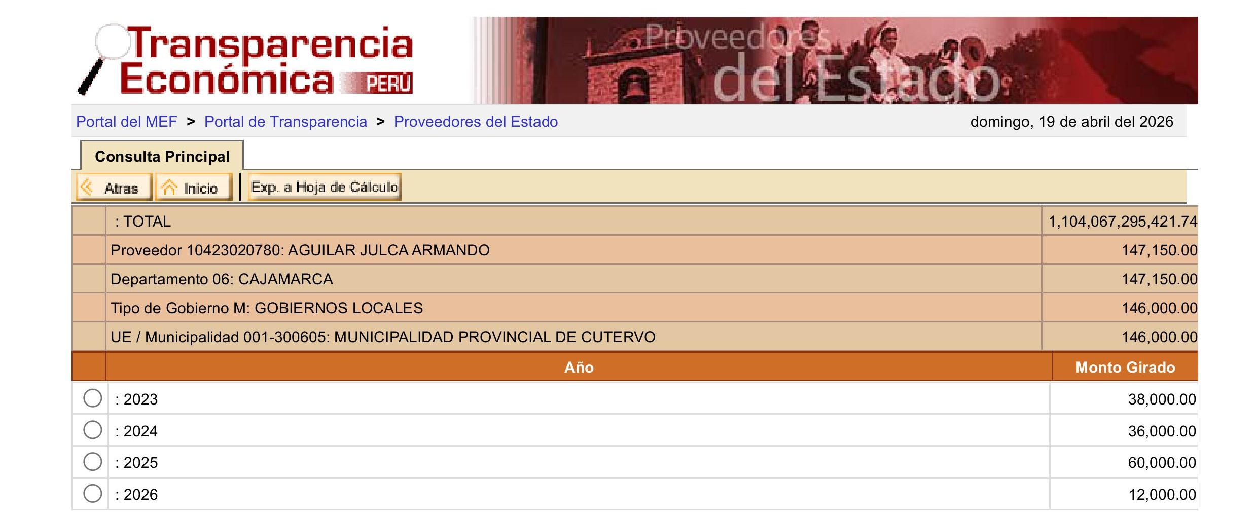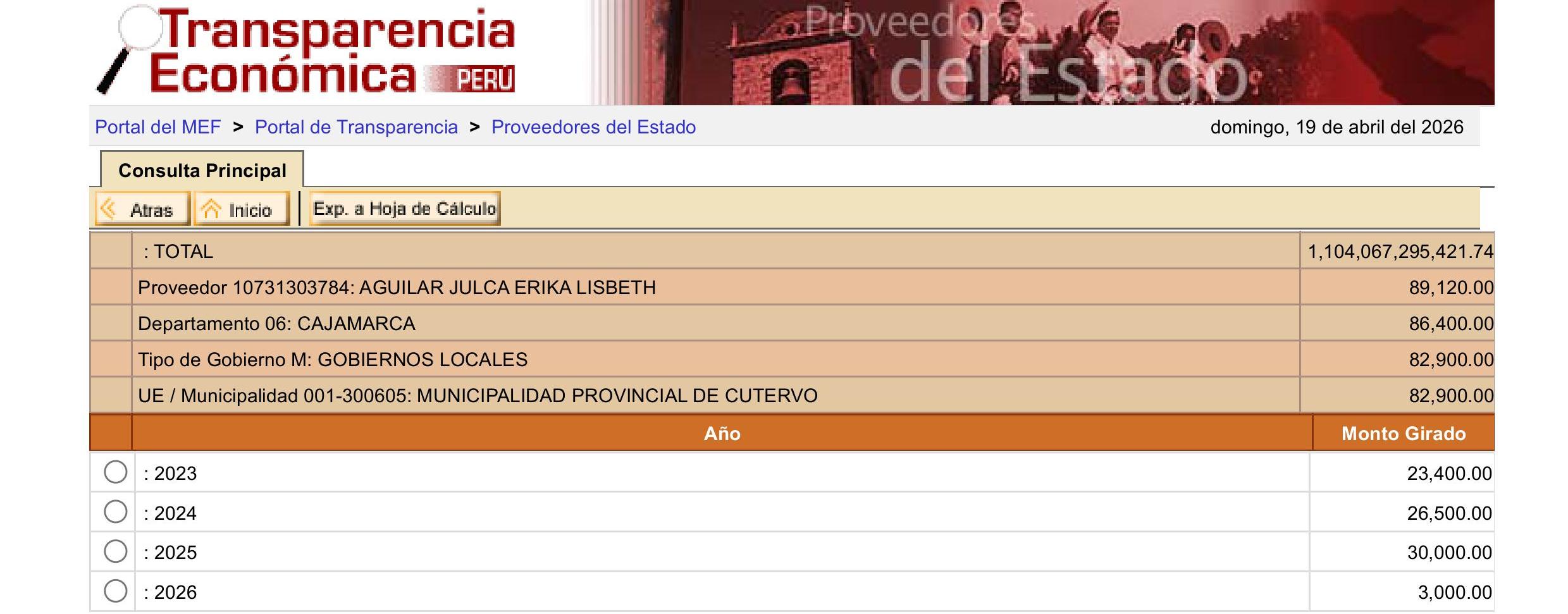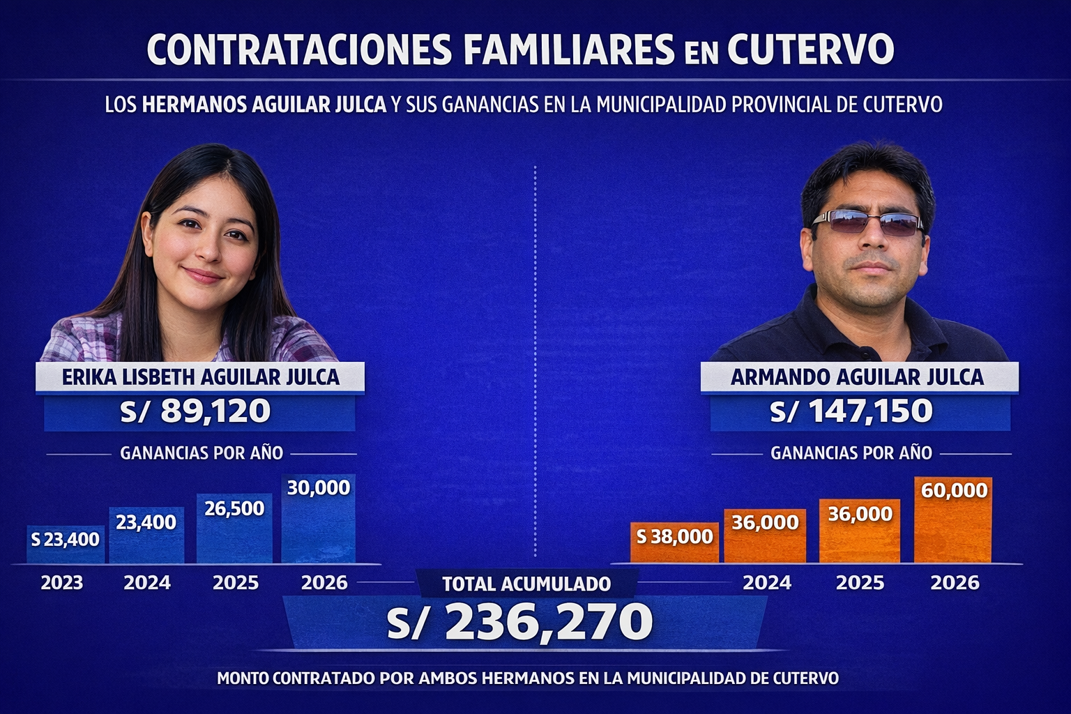 El caso de Armando Aguilar Julca no se limita a su rol dentro de la municipalidad. La investigación también alcanza a su entorno familiar directo. Erika Lisbeth Aguilar Julca, hermana del exfuncionario y responsable de APP en Cutervo durante el 2022, registra contrataciones con la misma entidad edil. De acuerdo con información oficial del Ministerio de Economía y Finanzas – MEF, exactamente el de Consulta Amigable, entre ambos hermanos suman más de 236 mil soles en montos girados por la Municipalidad Provincial de Cutervo en los últimos años.
