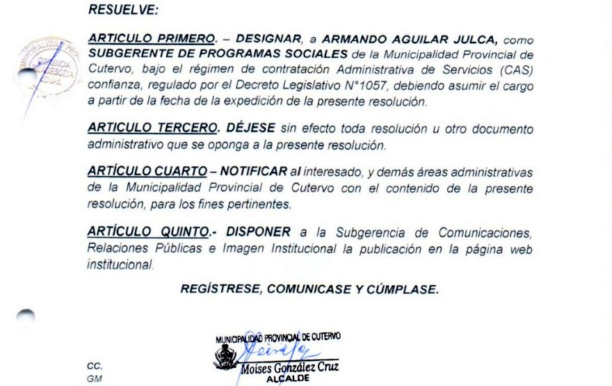 De los documentos oficiales que Otra Prensa ha revisado se desprende que Aguilar Julca fue designado como subgerente de Programas Sociales mediante la Resolución de Alcaldía N.º 014-2023-MPC/A, emitida el 3 de enero de 2023. Consecutivamente, tras las denuncias difundidas por este medio y repercutidas en medios de locales de Cutervo, su designación fue dejada sin efecto mediante la Resolución de Alcaldía N.º 129-2023-MPC/A, del 3 de marzo del mismo año. Sin embargo, versiones recogidas por este medio señalan que habría continuado vinculado a la entidad bajo otra modalidad contractual, desempeñando funciones similares desde un cargo distinto, lo que le habría permitido mantener influencia en la gestión del área en la que se inició.