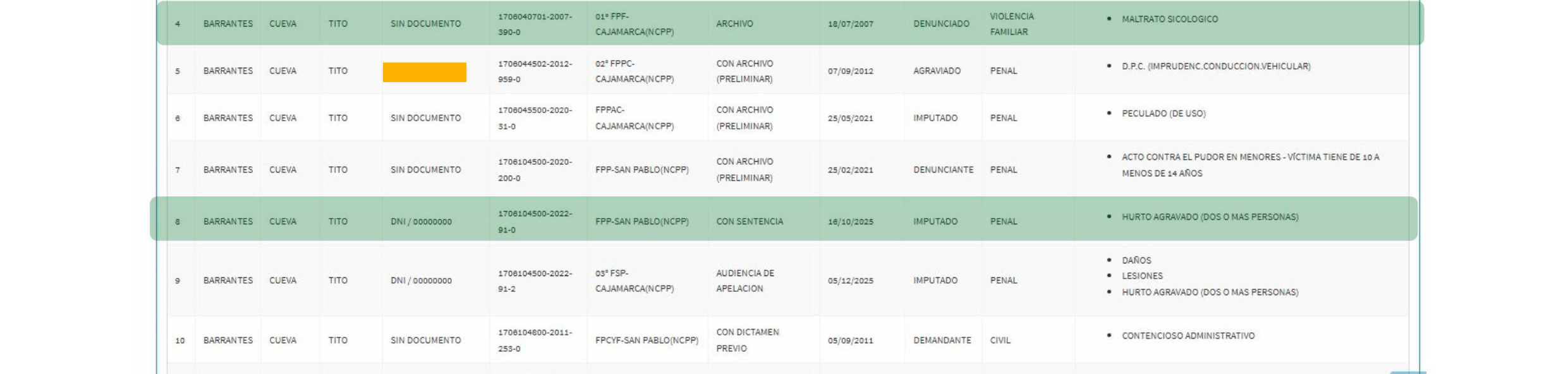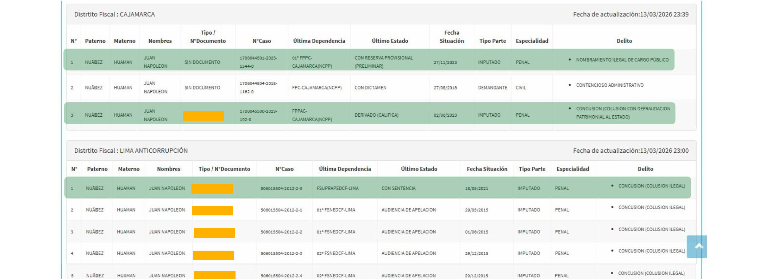 Asimismo, aparece el nombre de Juan Napoleón Núñez Huamán, quien registra actuaciones vinculadas a presuntos delitos contra la administración pública, como concusión, en instancias fiscales de Cajamarca y Lima. En su caso, se advierte la existencia de procesos con diferentes estados, incluyendo algunos con actuaciones en sede judicial registradas y otros en trámite.