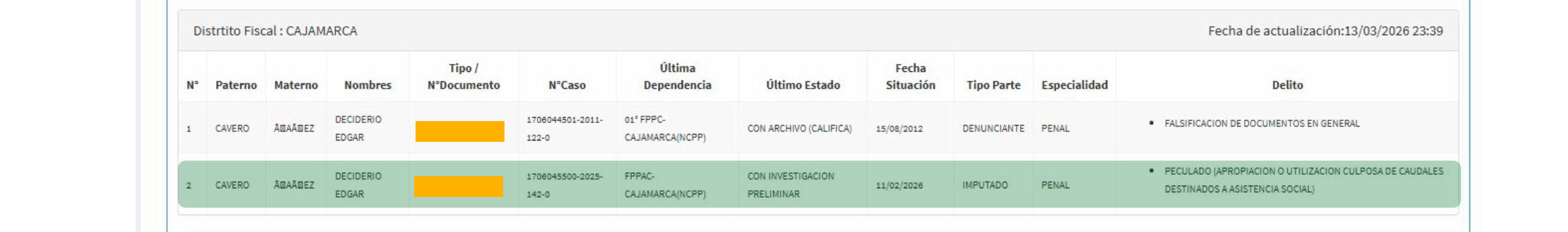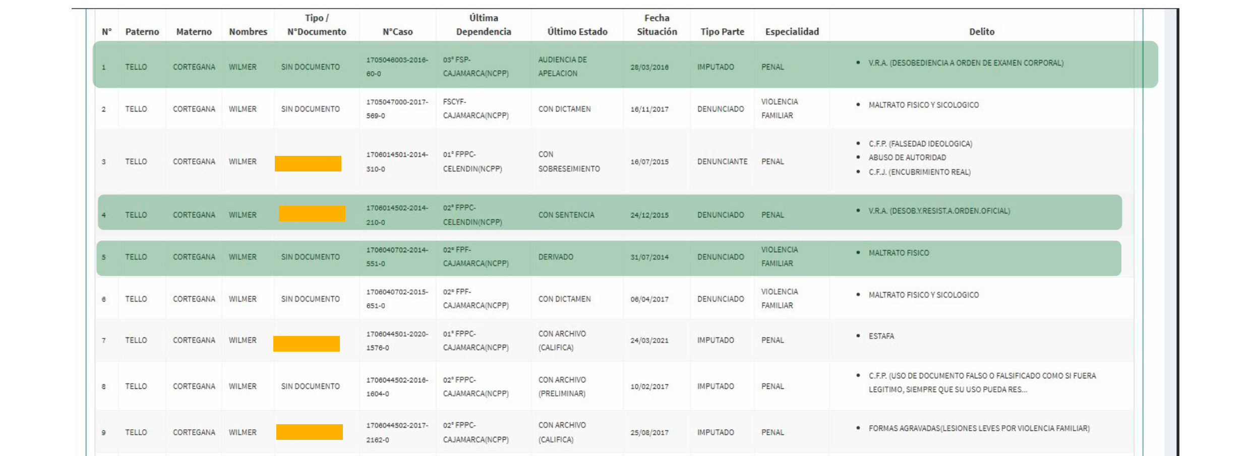 Del mismo modo, se identifican registros correspondientes a Teresa del Rosario Vidal Villanueva y Wilmer Tello Cortegana, vinculados a investigaciones en materias como lesiones, omisión de denuncia, violencia familiar, estafa y presunta falsificación de documentos, entre otros, todos ellos en el marco de actuaciones fiscales cuyo estado varía entre trámite y archivo.