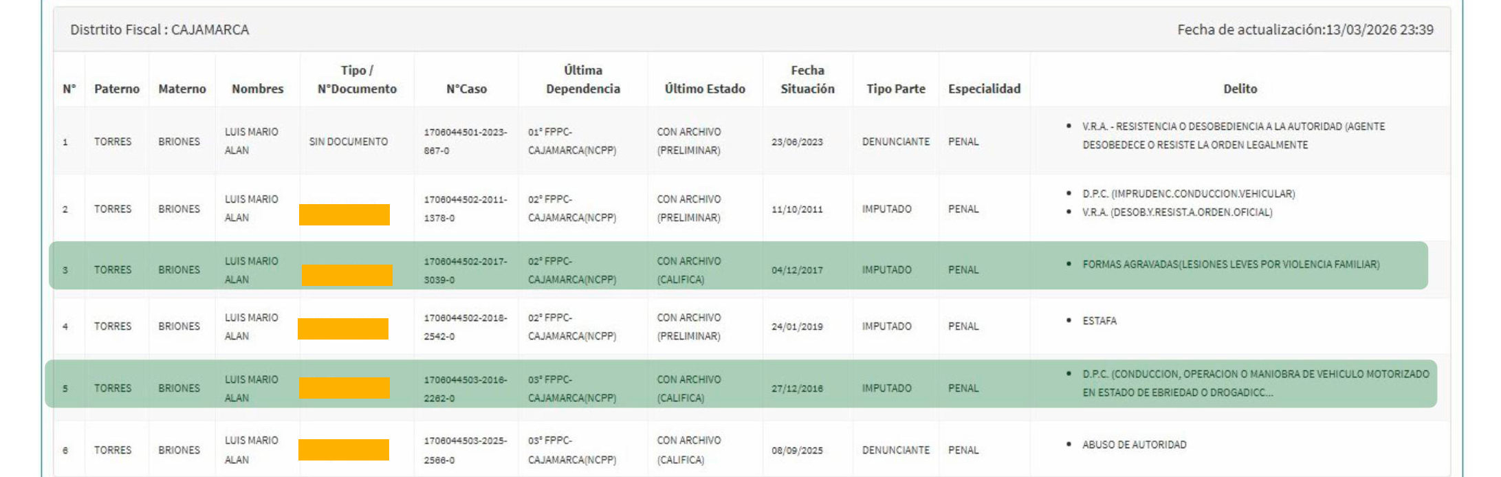 En esa misma línea, figura Luis Mario Alan Torres Briones, con registros asociados a investigaciones por presuntos delitos como resistencia o desobediencia a la autoridad, conducción en estado de ebriedad, lesiones y estafa, consignados en la Fiscalía de Cajamarca, en diversos estados procesales.