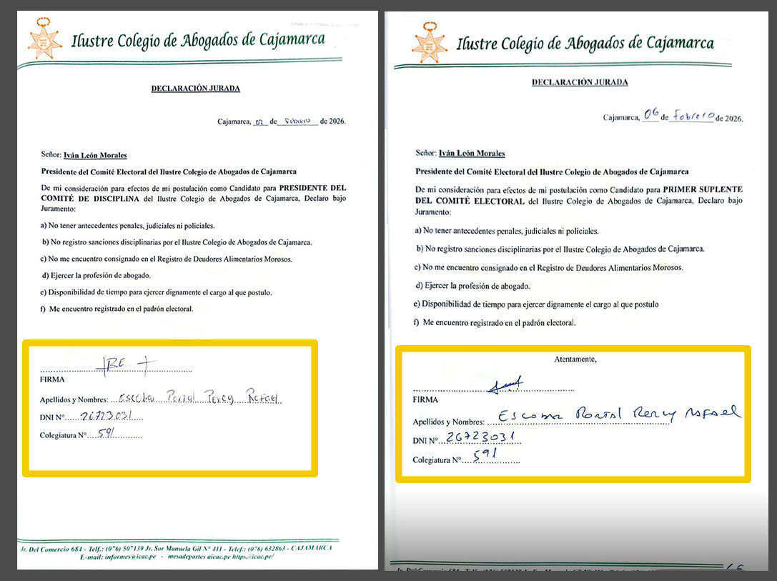 Hay dos declaraciones juradas firmadas en nombre del abogado Escobar Portal. Una, de fecha 2 de febrero de 2026, para postularse como presidente del Comité Disciplinario en la lista “Unidad Jurídica.” La otra, del 6 del mismo mes, para el cargo de Primer Alterno del Comité Electoral en la lista “Integración y Gestión Solidaria.” Ambas indican el mismo número de DNI y su número colegial. Pero las firmas presentan evidentes diferencias en su trazo y estilo. Esto último, ya de por sí, genera dudas.