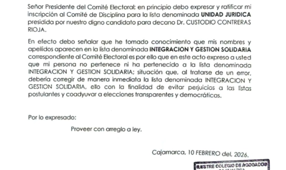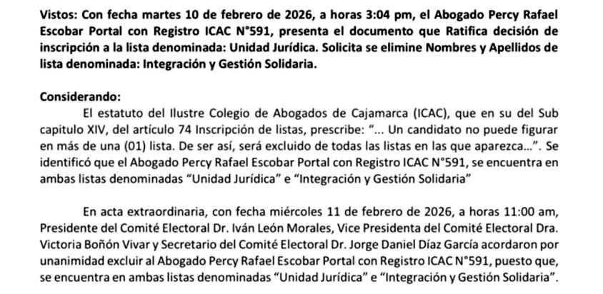 A esto se suma que el propio abogado presentó el 10 de febrero un documento ratificando su decisión de unirse a la lista “Unidad Jurídica” y requiriendo que su nombre fuera retirado del otro grupo. Este documento fue anterior a la emisión de la Resolución N.º 02-2026-CE-ICAC. No obstante, el Comité Electoral aplicó el artículo 74 de manera literal y ordenó su exclusión de ambas listas. La decisión fue tomada por el Comité Electoral compuesto por el Dr. Iván León Morales (Presidente), la Dra. Victoria Elizabeth Boñón Vivar (Vicepresidenta) y el Dr. Jorge Daniel Díaz García (Secretario), quienes firman la resolución el 11 de febrero de 2026.