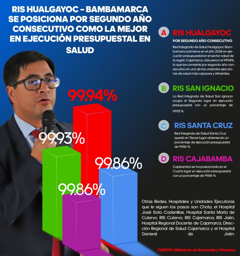 La Red Integrada de Salud Hualgayoc-Bambamarca (RIS) continúa fortaleciendo sus políticas, intervenciones y estrategias para el bienestar de la población. De acuerdo a la consulta amigable del Ministerio de Economía y Finanzas (MEF) al cierre del año 2024, la RIS ocupa el primer lugar en el ranking de ejecución presupuestal a nivel de todas las Redes Integradas de Salud, Unidades Ejecutoras, entre las que se encuentran también los más importantes hospitales de la Región Cajamarca.