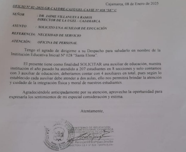 El punto de partida no se encuentra en la UGEL, sino en la Institución Educativa N.° 028 “Santa Elena”. Mediante el Oficio N.° 02-2025-GR-CAJ/DRE-CAJ/UGEL-CAJ/IE N.° 028 “SE” C, de fecha 8 de enero de 2025, la directora del plantel solicitó formalmente la asignación de un auxiliar de educación.
