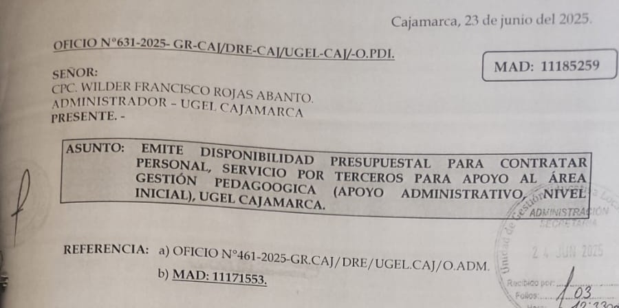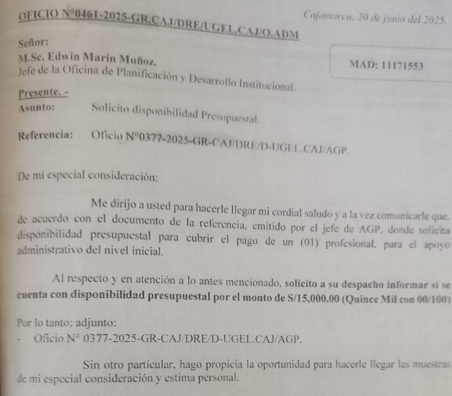 Ese mismo día, mediante Oficio N.° 0461-2025-GR.CAJ/DRE/UGEL.CAJ/O.ADM, el jefe de la Oficina de Administración solicitó a la Oficina de Planificación y Desarrollo Institucional la correspondiente disponibilidad presupuestal para la contratación del apoyo administrativo al nivel inicial, dando continuidad al trámite.
