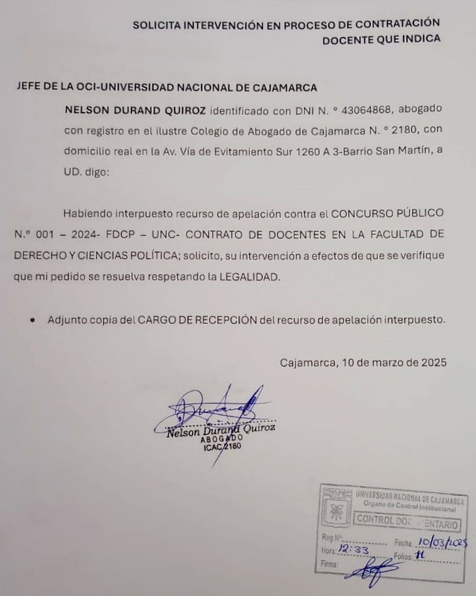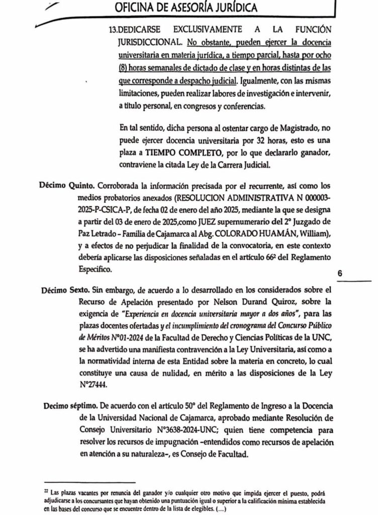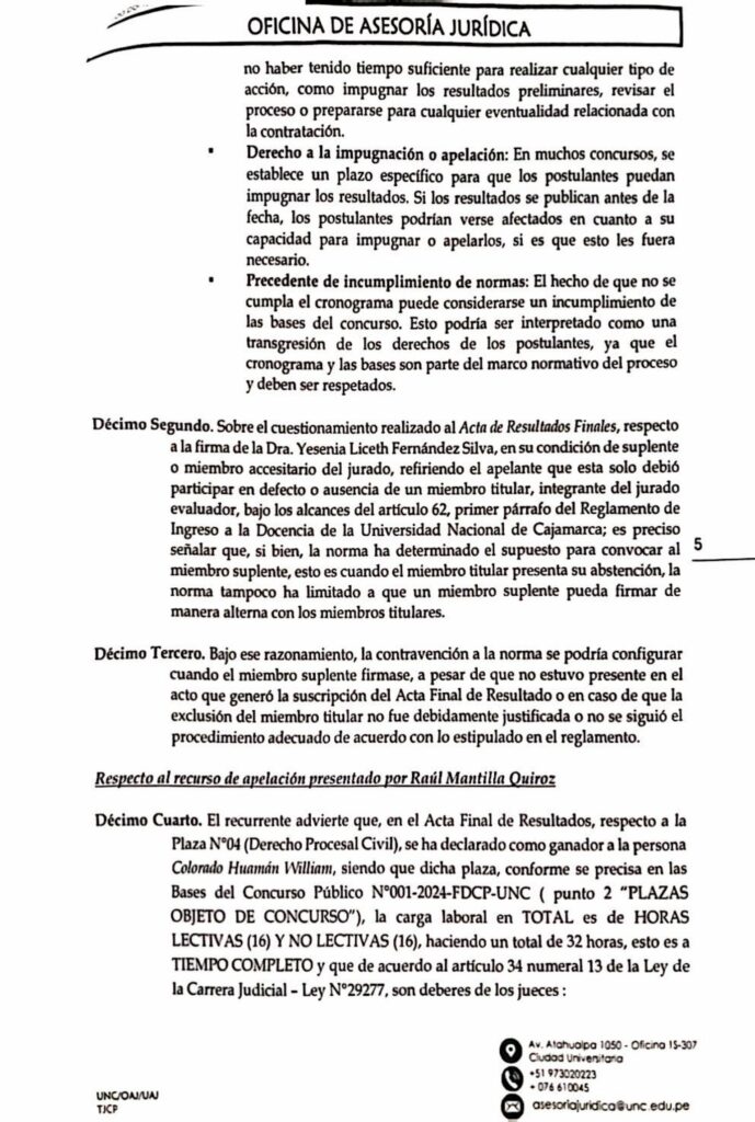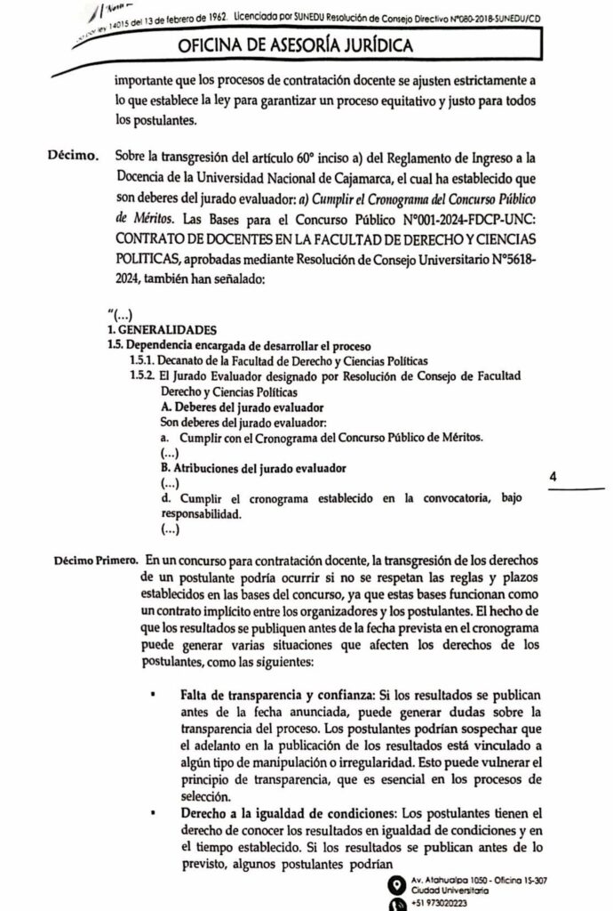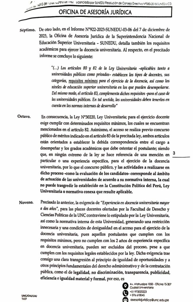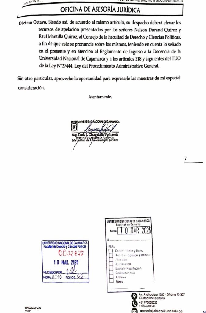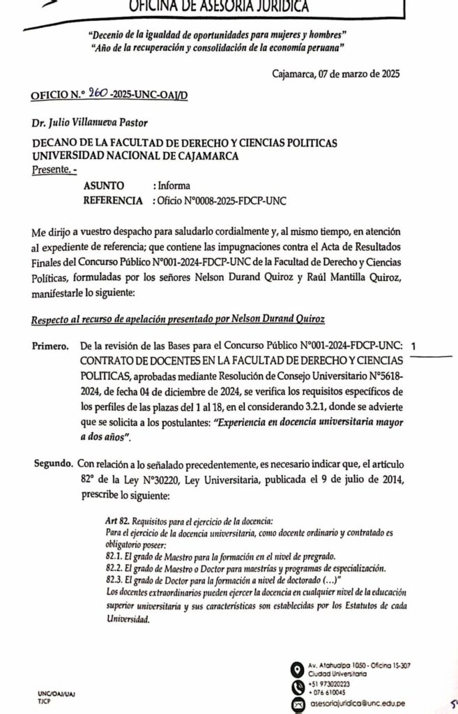 Un ciudadano, al percatarse de estas irregularidades, interpuso un recurso de apelación denunciando lo que considera una vulneración a los principios de acceso igualitario y mérito en el servicio público. En respuesta a este reclamo, la Oficina de Asesoría Jurídica de la UNC emitió el Oficio N.° 260-2025-UNC-OAJ/D, fechado el 7 de marzo de 2025, en el que reconoce que dicho requisito genera «una restricción innecesaria y una condición de desigualdad en el acceso para el ejercicio de la docencia universitaria». La Oficina de Asesoria Jurídica concluye que los postulantes que cumplen con los requisitos legales establecidos por la normativa vigente no deberían ser excluidos por esta limitación adicional impuesta en las bases del concurso.